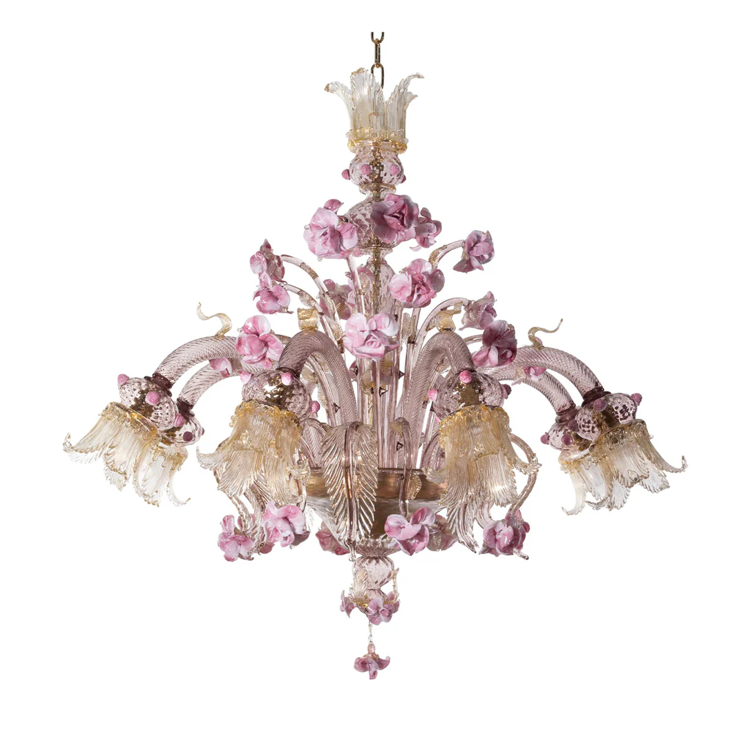 Rezzonico chandeliers feature multiple tiers, intricate botanical motifs, and arms constructed from segmented glass elements, and they are almost always multi-colored. Among historical Murano styles, Rezzonico is the most grand and opulent.
